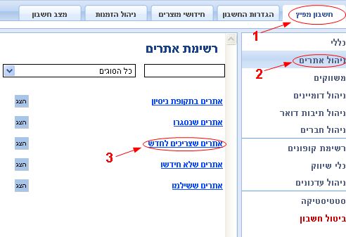 3. אם ברצונכם לטפל באתרים שתוקף המנוי שלהם מתקרב לסיומו, ניתן לראות אותם מרוכזים בחשבון מפיץ >> ניהול אתרים >> אתרים שצריכים לחדש.