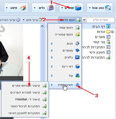 1. לחיצה על הקישור בתפריט העליון >>  "ניהול עמודים".