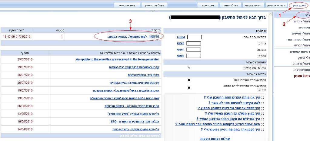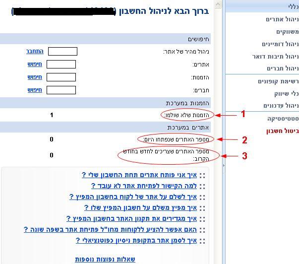 חשבון המפיץ משמש בדיוק לצורך זה, בעמוד הראשי בחשבון המפיץ ניתן לעקוב אחרי הנתונים החשובים בניהול הלקוחות, מספר אתרים חדשים שנפתחו, כמה הזמנות ממתינות לאישור, כמה אתרים ממתינים לחידוש המוצרים ועוד.